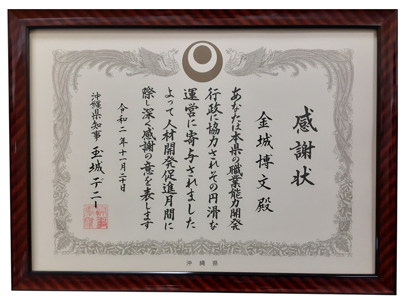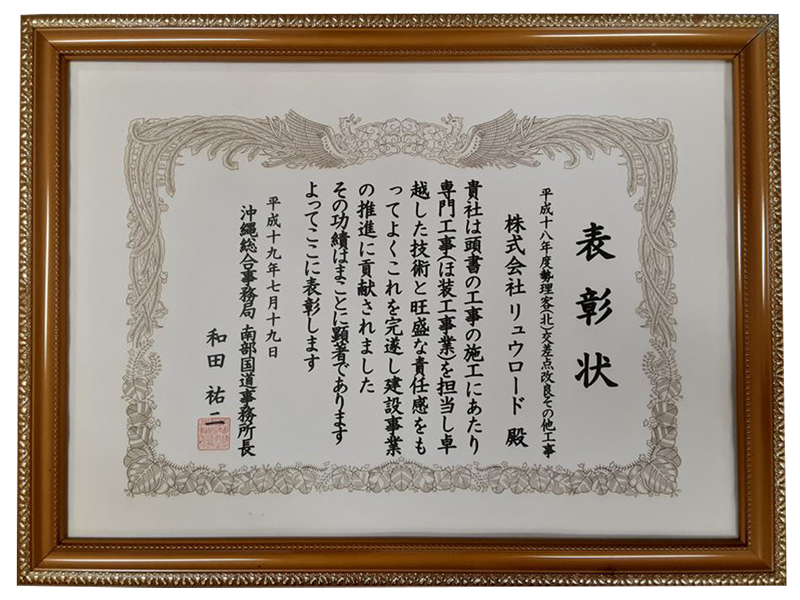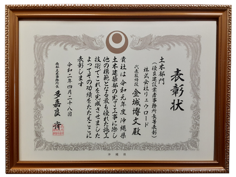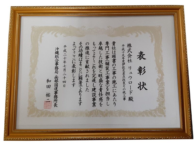そして、リュウロードは、道づくりに貢献するとともに、社訓に掲げるとおり、私たちの仕事は、人の命や家庭を守る天職であると自覚し、自信と誇りをもって沖縄の50年先100年先の未来へと続く「道づくり」に挑戦し続け、安全・安心なまちづくりに貢献していく所存でございます。